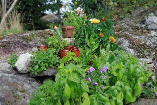 Hvis du ikke vil ha et stenparti, kan det være like så greit å dyrke krydderurter i urtepotter eller pallekarmer. Sørg for at plassere krydderurterne på et sted i hagen, hvor solen skinner en stor del av dagen.