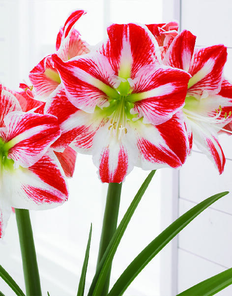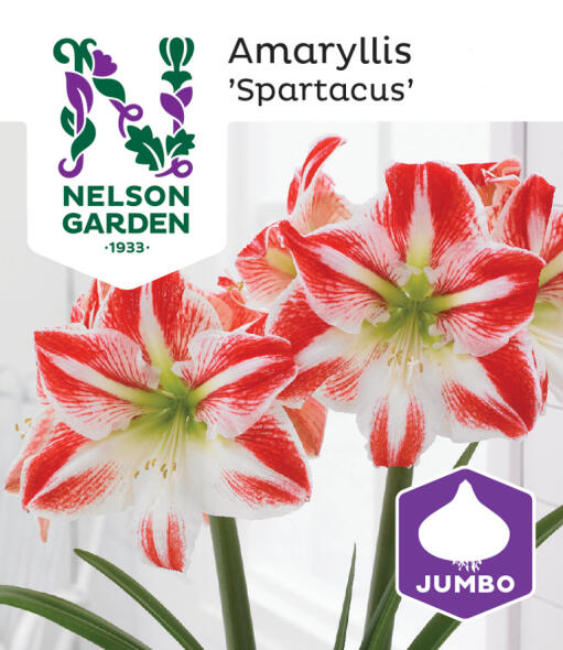 Fortryllende røde- og hvitspraglende blomster, svært riktblomstrende i lang tid! Lettdyrket. Fantastisk juleblomst, også som snittblomst. Denne ekstra store og kraftige løken blomstrer på minst tre stengler, oftest på fire.