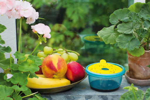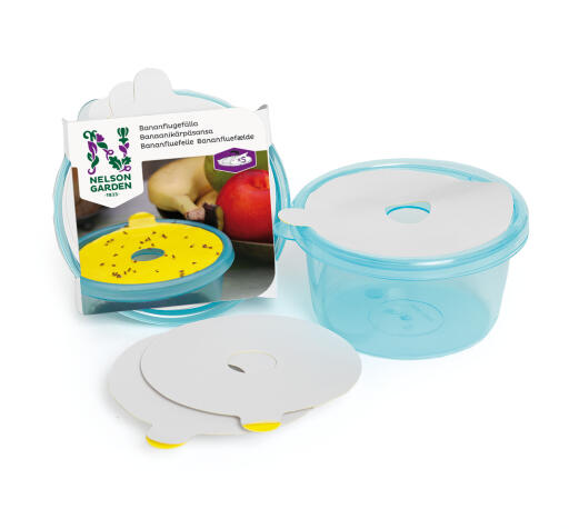 Felle for bananfluer som enten fanges på limark på lokket, eller drukner i væsken i boksen. Inkl. 5 limark.