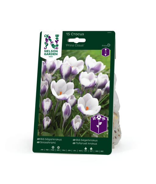 'Prins Claus' er en sort blå begerkrokus som har store hvite blomster og de ytre kronbladene har blåfiolette flekker. I tillegg til i bedet passer den fint i kanten av busker og foran trær der vårsolen lyser. Vakker plantet i grupper i glissent gress.