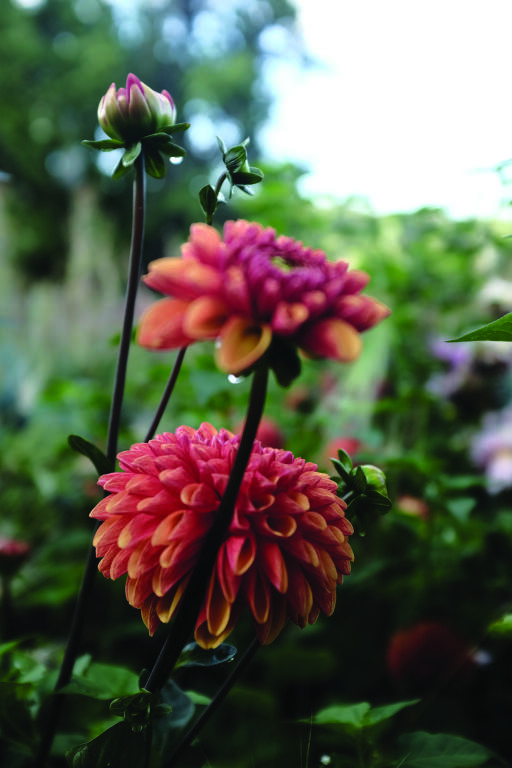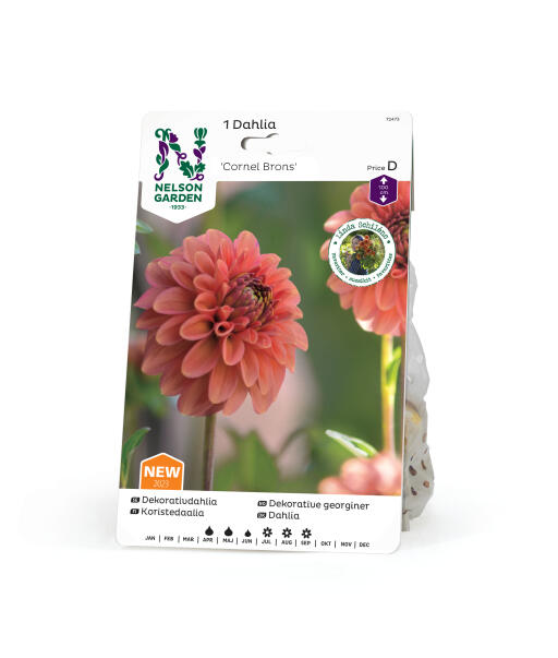 Høy, aprikosfarget pompon-georgine med mørke stilker, som er flotte som snittblomster. En sommerskjønnhet i bed og bukett.