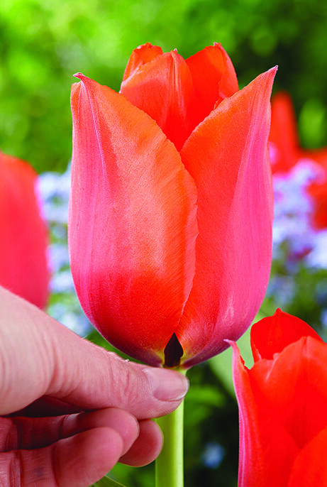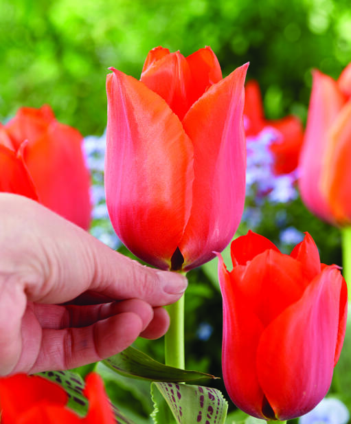 Tulipanen med den fantastiske store blomsten (opptil 20 cm), en oransjerød gigant på en stabil og kraftig stilk. Naturligvis en storslått snittblomst. Det bregnegrønne bladverket er også dekorativt med sitt kastanjefargede mønster.