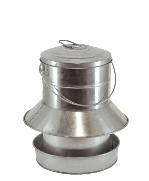 Romslig fuglemater for fuglefrø. Av galvanisert stål og utstyrt med skjerm som beskytter maten mot fukt og store fugler. Fylles ovenfra ved å ta av lokket. Bøyle for oppheng. Rommer hele 9,5 liter.