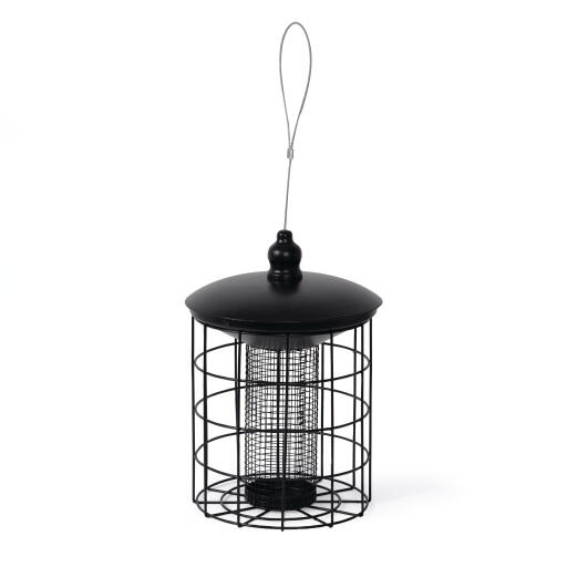 Fuglemater for nøtter med beskyttelse som stenger ute f.eks. ekorn. Magasinet rommer mye mat og fylles på i lokket. Med vaier og karabinkrok. Svart metall H 29 cm, Ø 20 cm.