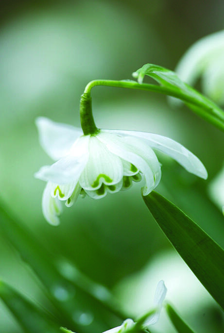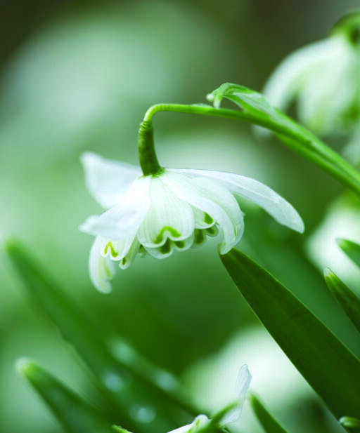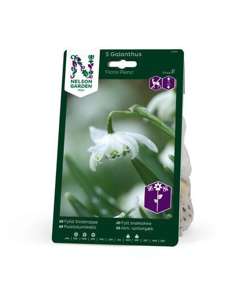 En fylt snøklokke med grønnspissede indre blomsterblad som dekkes av kritthvite ytre blomsterblad. Disse små skjørtlignende skjønnhetene har tiltrukket dyrkere helt siden 1731. Anses som mindre appetittlig for rådyr, hare, kanin og markmus.
