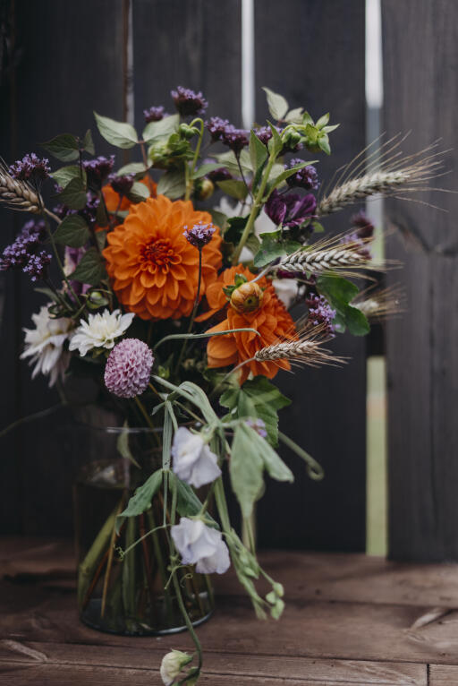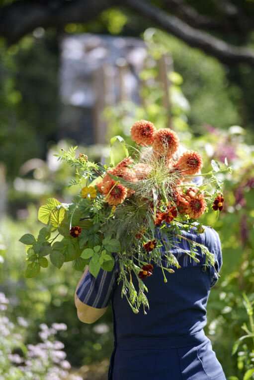 En søt georgine der solnedgangens brennende farger - gult, oransje og teglsteinsrødt - samles på kronbladenes frem- og bakside. Den fylte blomsten minner om en pompomgeorgine, og den første etterfølges av mange flere.
