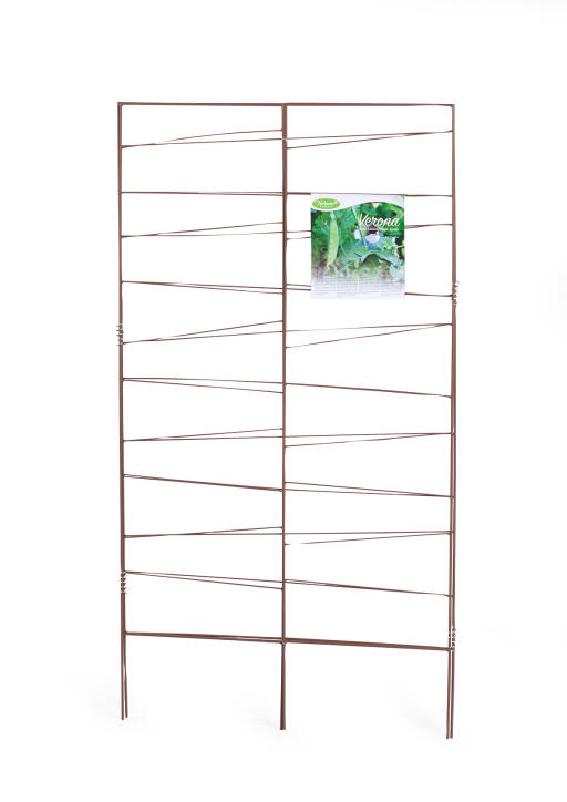Rustfarget espalier i tre seksjoner, for pallekarm og friland. Kan også brukes som grønn romdeler i uterom. Vinkles for økt stabilitet. Av pulverlakkert stål. Mål: 36+75+38 cm, høyde 140 cm.
