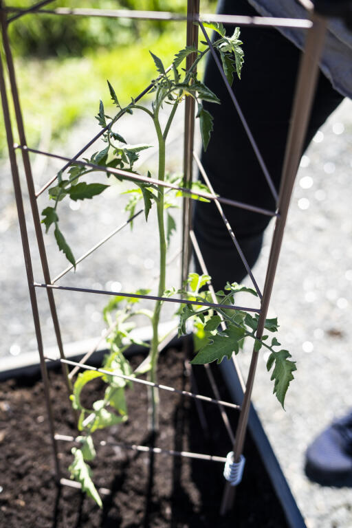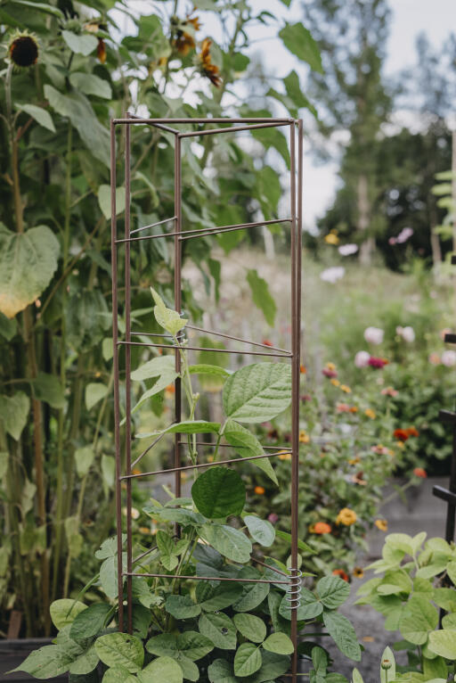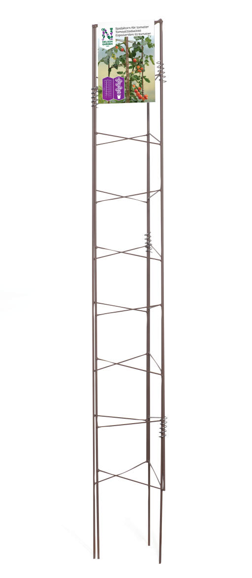 Smart plantestøtte til høye planter, først og fremst tomat og agurk. En tredelt epalier som plasseres rundt planten som et stødig tårn. Av pulverlakkert stål, rødbrun. Høyde 140 cm, bredde 23 + 25 + 23 cm.