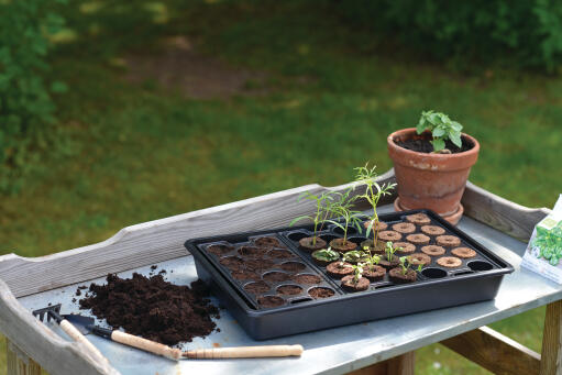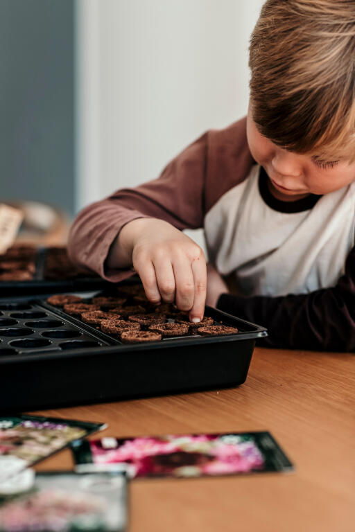 Spirekasse og minipluggbrett til jord eller planteplugger. Forenkler såing, forkultivering og omplanting. Kasse av gjenvunnet polypropen (PP), brett av polystren (PS). 14 planteplugger av komposterbar kokosfiber, torv og næring er inkludert. 23 x 37 cm