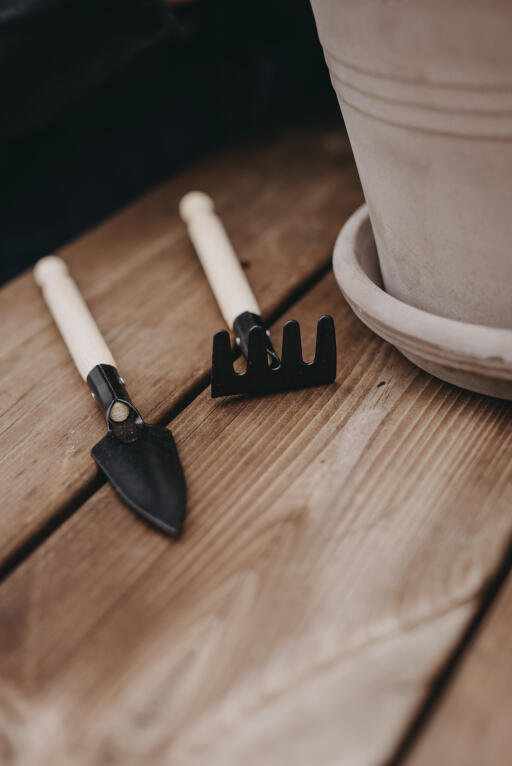 Flott omplantingsett. Inneholder minispade, minirive, og priklepinne.