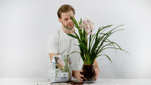 1. Plant om orkideen når potten er full eller det henger røtter over kanten. Gjør det gjerne i plantens hvileperiode, når den ikke har blomster, og bruk både inner- og ytterpotte.