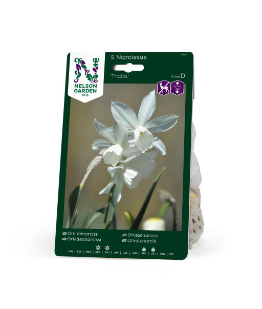 'Thalia' er en orkidénarsiss og tilhører Triandrus-gruppen. Sorten har et grasiøst utseende med flere rent hvite, nikkende blomster i toppen av hver stengel. Meget søt i bedet. Anses som mindre appetittlig for rådyr, hare, kanin og markmus.