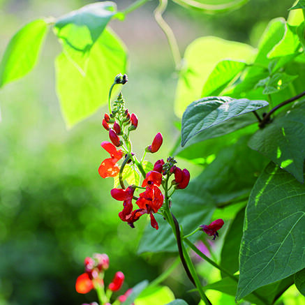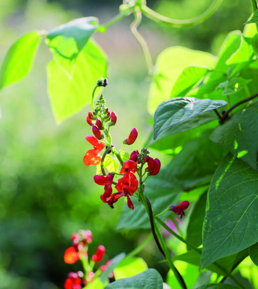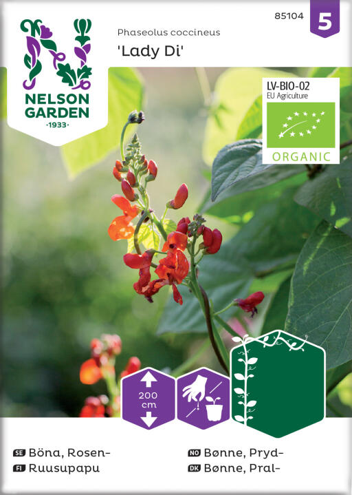 Økologiske frø. En motstandsdyktig prydbønne med vakre, røde blomster. Fin å dyrke mot f.eks. et espalier på lunt sted. Gir rikelig avling med smakfulle, grønne belger som brukes kokte, som snittbønner.