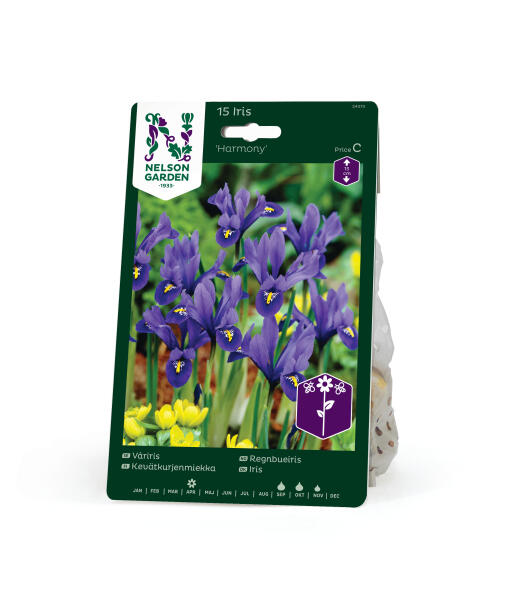 Iris betyr regnbue på gresk, og denne lille, vakre irisen tilhører gruppen regnbueiris. Sorten 'Harmony' har intenst blå blomster med hvite og gule tegninger. Passer fint f.eks. i et tørt og varmt steinparti. Utmerket å dyrke i potte.