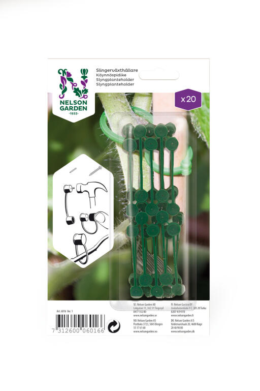 Løkker som kan åpnes/lukkes, inkl spiker. For oppbinding av planter mot tre/betong. 20stk.