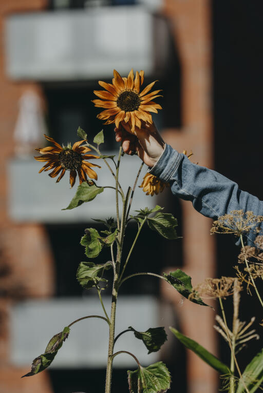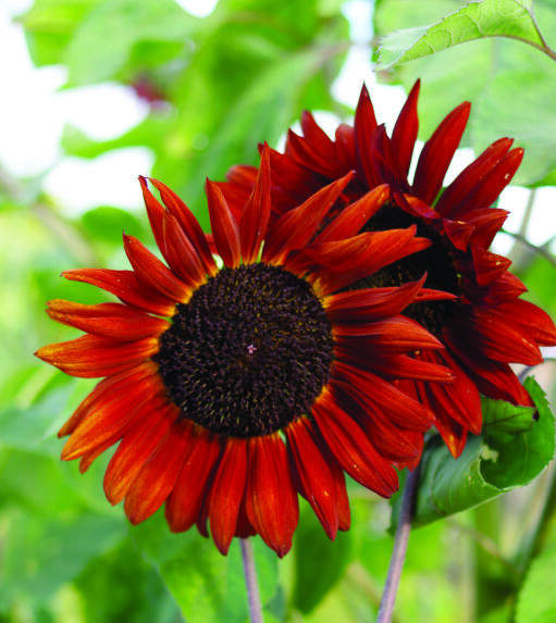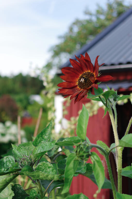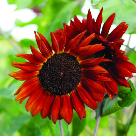 Økologiske frø. Høy og lettdyrket solsikke med røde blomster. Sorten gir høye planter med god forgrening og mange blomster. Fantastisk i bukett.