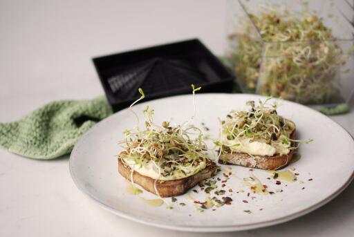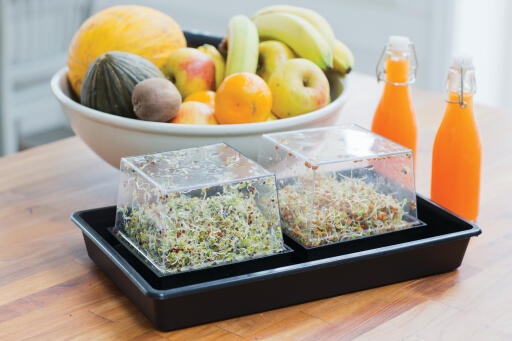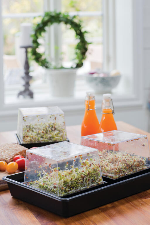 Med hjelp av spireboksen er det enkelt å spire ulike sorter frø, f.eks alfalfaspirer. 15 x 15 cm