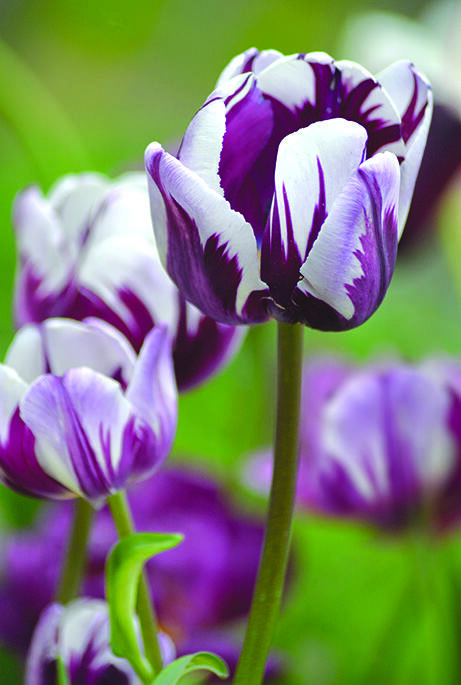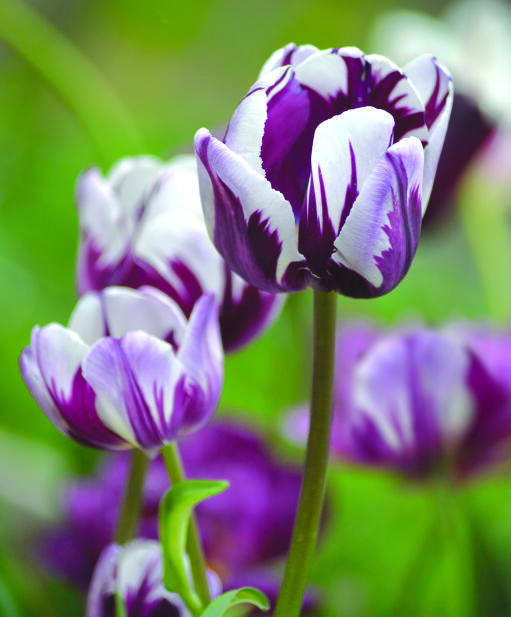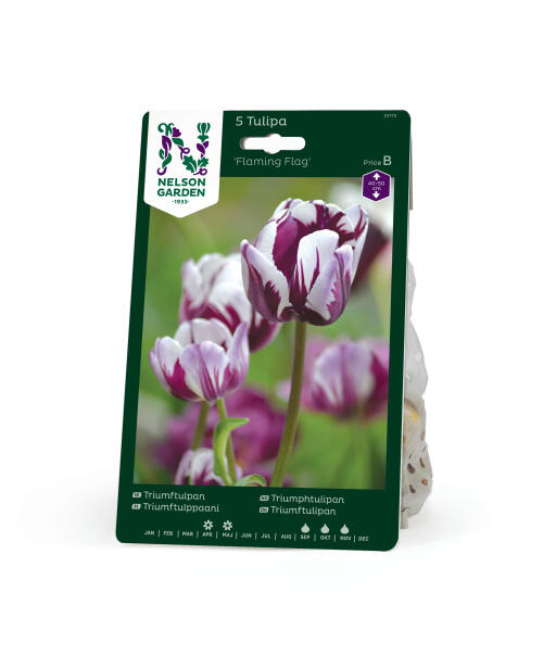 Ja, visst ligner denne staslige triumftulipanen et flammende flagg som vaier i lilla og hvitt i vinden. Blomstrer lenge og er like holdbar i bedet som i den elegante vårbuketten.