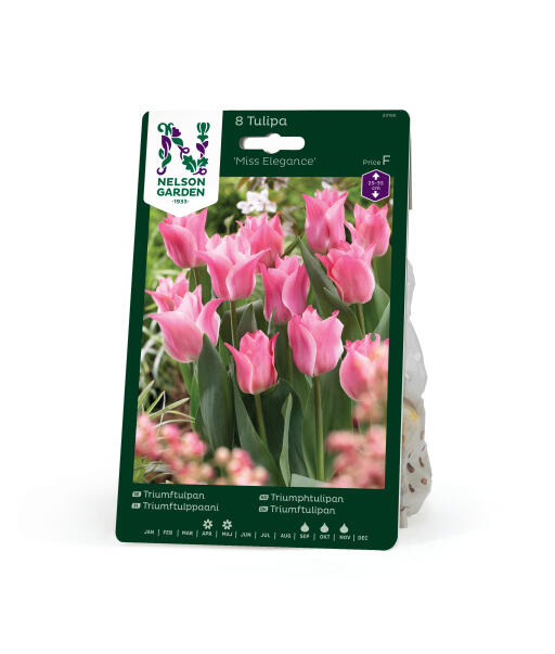 Denne elegante frøkenen holder hodet høyt i hagens bed. Den lyse pastellrosa fargen er også herlig i søte vårlige buketter. 'Miss Elegance' tilhører triumphgruppen og ble introdusert i 2002.