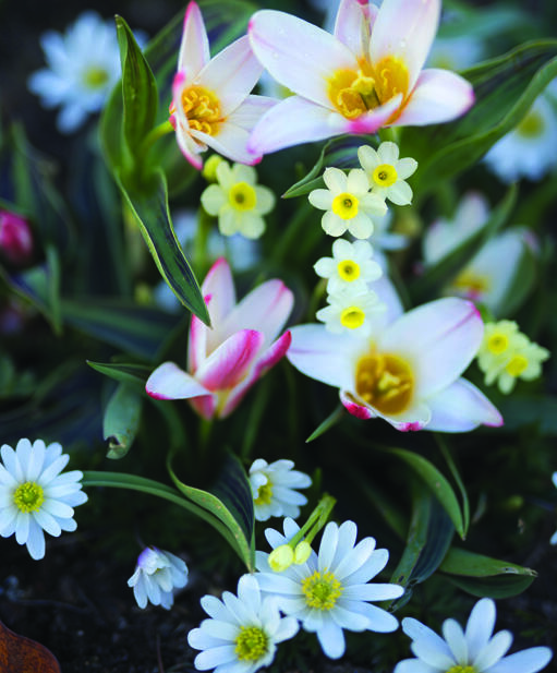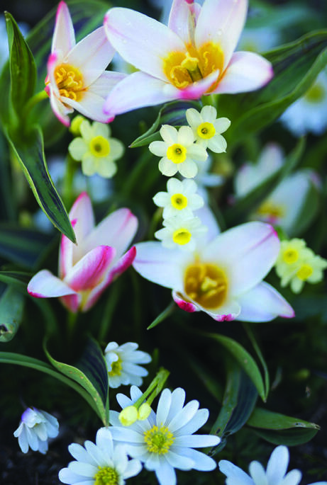 En søt miks av tulipan, narsiss og balkansymre for blomsterbed, potte eller kurv. Blomstenes ulike høyder, farger og former løfter og fremhever hverandre og felles for alle er deres gule midtre som åpner seg mot solen.