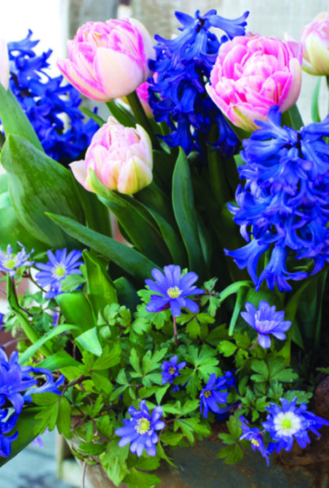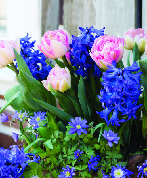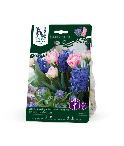 Med sitt smilende øye titter den søte balkansymren opp mot den duftende hyasintens tette krone. To vakre matchende blålilla nyanser som passer perfekt til den fylte tulipanens søte lillatoner. En yndig bukett for bed eller potte.