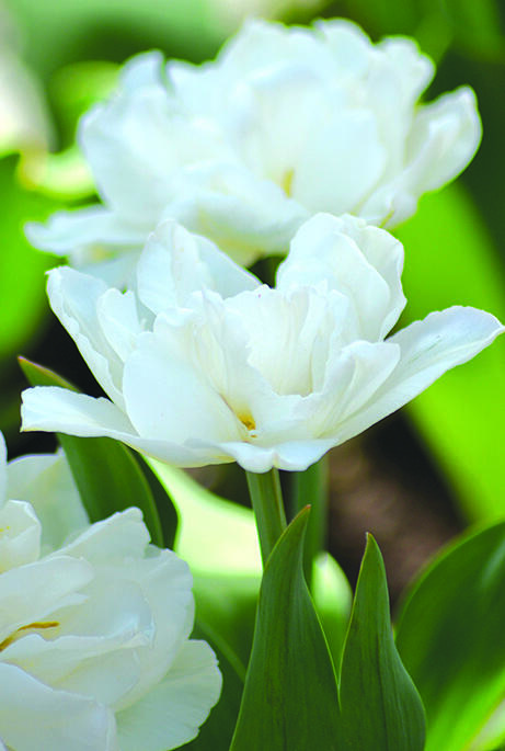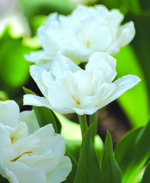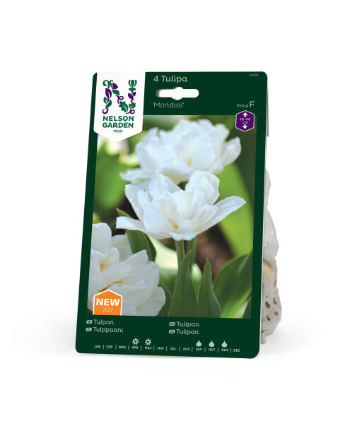 En tidligblomstrende tulipan med utsøkt luftige, hvite blomster som svever som skyer i bedet. Doble blomsterblad åpner seg opp til en mykt skålformet blomst med gul midte. Mondial har dessuten en mild duft.
