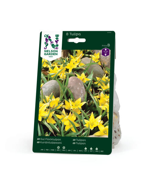 Den perfekte, lave tulipanen for tidlige, vårblomstrende bed og steinpartier. Over de dunkelt gråduggede bladene brer de stjerneformede, knallgule blomstene seg utover - ofte to på hver stilk! Etter blomstringen utvikles det dekorative frøstillinger.