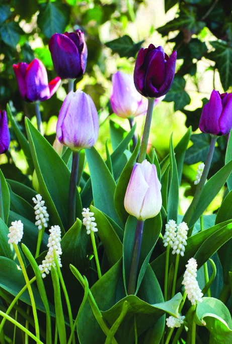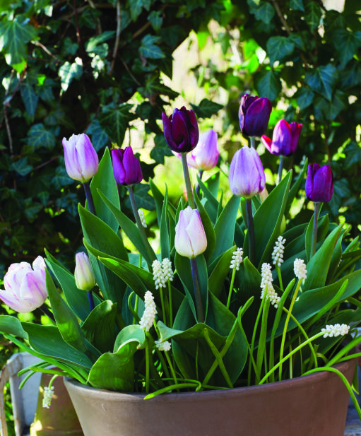 En balansert fargekombinasjon fra dempet vinrødt, via lillarosa toner til hviteste hvitt. Tulipanens klassiske form markeres flott av perlehyasintens drueklaser av kritthvite blomster. En stilren kombinasjon for blomsterbed eller potte.