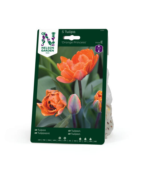 To ganger prisbelønnet skjønnhet som beholder litt av knoppens grønne farge etter den åpner sine lag av oransje kronblader. En velfylt og duftende, pionlignende tulipan med rødfiolette striper på de ytterste kronbladene. Passer utmerket i potte.