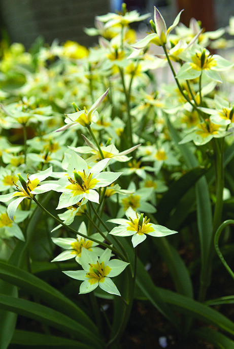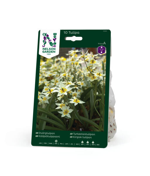 Turkestantulipanen blomstrer rikelig og får ofte flere små blomster på hver stengel. Blomstene, som åpner seg til en vid stjerne, er hvite på innsiden med gult sentrum. Utsiden av kronbladene er svakt gråfiolett med gul basis.