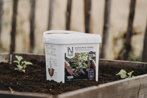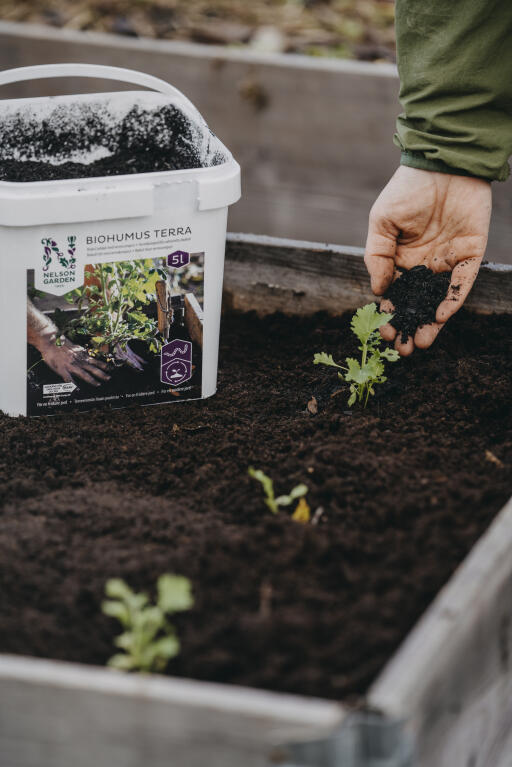 Biohumus Terra er mild mot planterøtter og forbedrer jord utendørs og i drivhus. Biohumus Terra tilfører mikroliv og karbon, og kan brukes til perenner, planting av busker og trær, ved dyrking av grønnsaker, urter og sommerblomster i bed, pallekarmer eller større potter og urner.